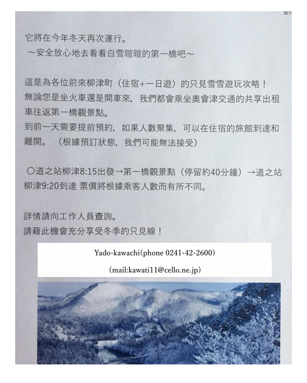 柳津町にご宿泊のお客様向けに、特別な冬の観光体験をご案内いたします。電車でもお車でもお越しの方を、只見川の雪景色を楽しめる絶景スポット「第一只見川橋梁ビューポイント」へご案内いたします。