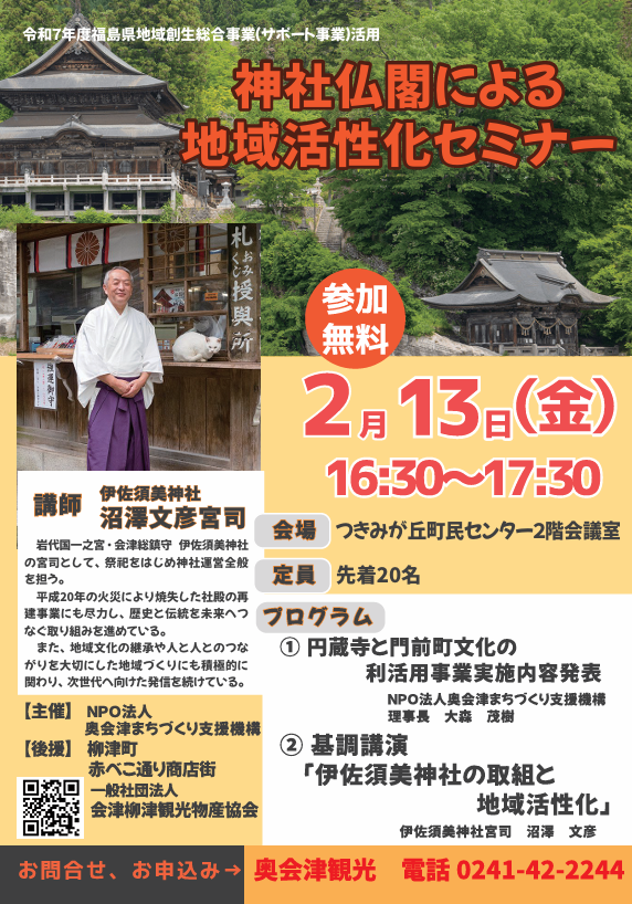 地域の歴史や文化を支えてきた神社仏閣。その魅力や役割を改めて見つめ、地域活性化につなげるためのセミナーを開催します。講師には、伊佐須美神社の宮司・沼澤文彦氏をお迎えし、神社の歴史や地域との関わり、そして未来に向けた取り組みについてお話しいただきます。